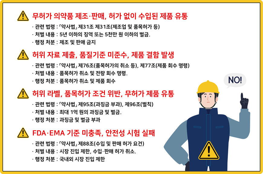 의약품을 제조하거나 판매하기 위해서는 국가 규제기관(예: 식약처, FDA, EMA 등)의 품목허가를 받아야 합니다. 허가 절차는 제품의 안전성과 유효성을 검증하는 데 중점을 둡니다.