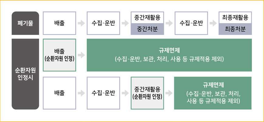 환경부의 심사를 거쳐 ‘폐기물이 아닌 자원’으로 인정되며, 인정 이후에는 폐기물 관리 규제를 적용받지 않습니다.