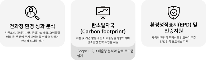 - 분석 결과를 바탕으로 개선 방안을 도출하고, 새로운 LCA 기준을 설정합니다.또한 LCA 결과를 ESG 경영 전략에 통합하여 지속 가능성 목표 달성을 지원합니다.