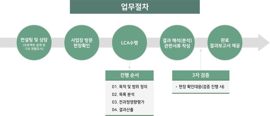 LCA 컨설팅은 제품이나 서비스의 전체 생애 주기를 분석하여 환경적 영향을 정량적으로 평가하는 서비스를 제공합니다. 이 과정은 원료 채취, 생산, 유통, 사용, 폐기 등 모든 단계에서 발생하는 자원 소비와 환경 부담을 체계적으로 파악할 수 있도록 돕습니다. 환경 성과 평가, 탄소 발자국(Carbon Footprint) 분석, 환경 성적표지(EPD) 인증 지원 등의 업무를 지원합니다.